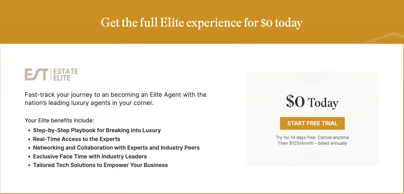 Ready to elevate your career and break into the luxury market? Estate Elite is giving you a FREE 14-day trial to experience everything our exclusive membership has to offer.